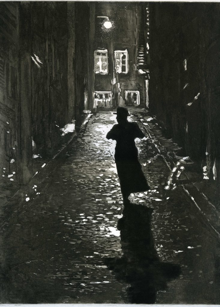 Guy Braun présente à la galerie l’Angélus à Barbizon une exposition d’une quarantaine d’oeuvres qui pourrait s’intituler « Arrêt sur images » . « Il y a comme une urgence à sauver une émotion vouée à être anéantie par l’image suivante », confie-t-il. L’artiste isole une scène d’un film expressionniste allemand, d’un classique du cinéma russe, des avant-gardes polonaises et hongroises ou encore d’un film d’Henri Verneuil. Impossible de reconnaître les acteurs, le propos est de capter l’élan d’un personnage placé dans un espace donné. « J’utilise les techniques de gravure qui sont en accord avec l’émotion que je désire servir. Ainsi l’aquatinte au sucre permet de saisir le mouvement grâce à la spontanéité du pinceau. La manière noire au contraire amplifie la lumière et révèle le mystère statique du moment retenu. Mais il y a aussi la recherche d’autres noirs que ceux offerts par le berceau, j’utilise alors le carborundum, qui donne des effets de matières, de gaufrages difficilement réalisables avec les procédés plus classiques. » Au spectateur de s’amuser à reconnaître les films inspirant l’artiste et à inventer l’avant et l’après de l’instantané représenté